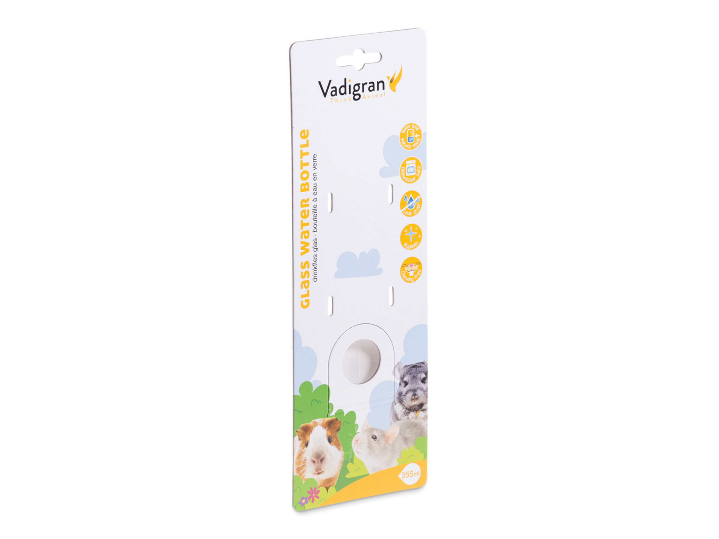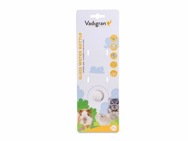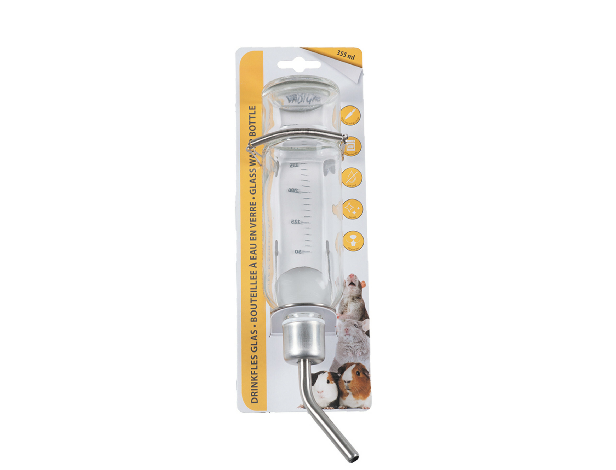 De heldere, glazen waterfles met ijzeren beugel kan eenvoudige aan kleine dierenkooien bevestigd worden; een plastic wortel geeft snel en eenvoudig het waterpeil aan zodat u weet wanneer u moet bijvullen