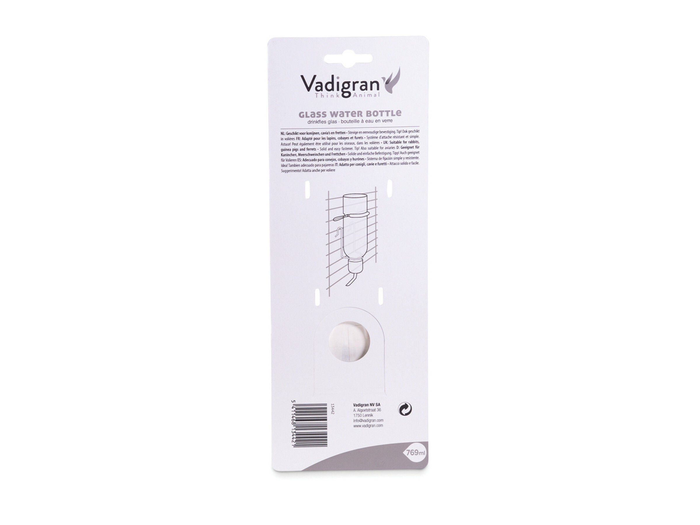 Deze glazen drinkfles met ijzeren beugel voor het stevig vastmaken aan de kooi. De kleine plastic wortel in de fles maakt het gemakkelijk om het waterniveau te zien.