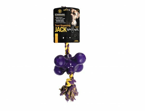 Duurzame Jack dispenser met katoenen touw om te spelen of om te gebruiken met snacks als tussendoortje. Starmark Interactive treats 156g (13000) zijn geschikt voor dit product.
