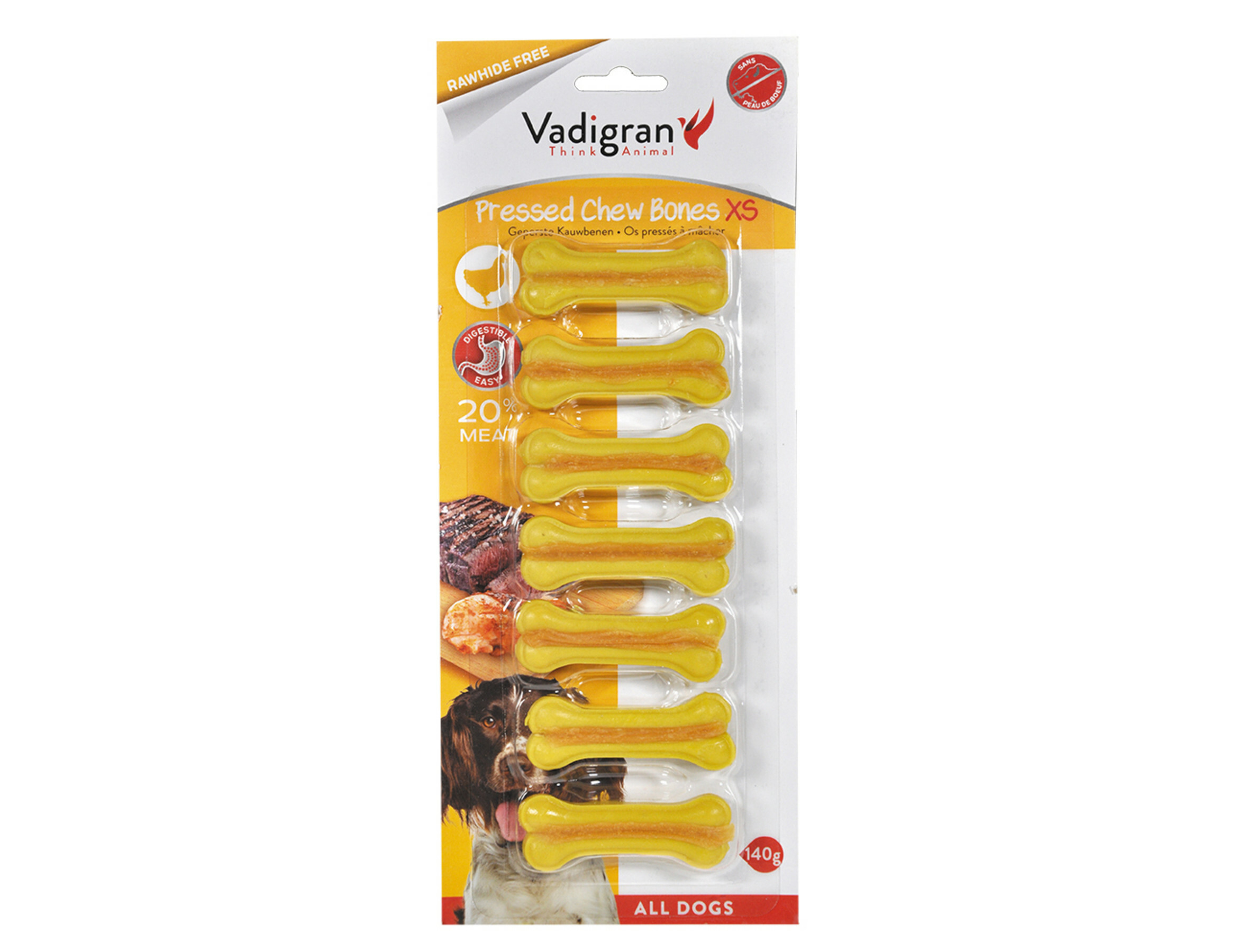 De Vadigran kauwbotten zijn de ideale snacks voor uw hond. Ze zijn samengesteld uit stevig geperste runderhuid en uit vlees dat het kauwbot een geur en smaak geeft die het natuurlijke kauwinstinct van uw hond zullen wakker maken. Ze bevatten geen kunstmatige kleurstoffen of smaken.Deze snack biedt je hond niet alleen plezier, maar is ook zeer bevorderlijk voor zijn mondgezondheid. Het kauwen zal namelijk de spieren van zijn kaken versterken, de snack zal uw hond helpen om zich te ontdoen van etensresten die zich tussen zijn tanden bevinden maar het zal ook op aangename wijze zijn tandvlees masseren.Omdat het arm aan vetstoffen is, kan je het met een gerust hart vaak aan je puppy of hond geven.