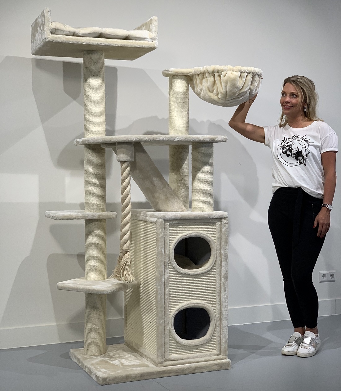 – Deze krabpaal is ruim 50 KG totaal en mega stevig.