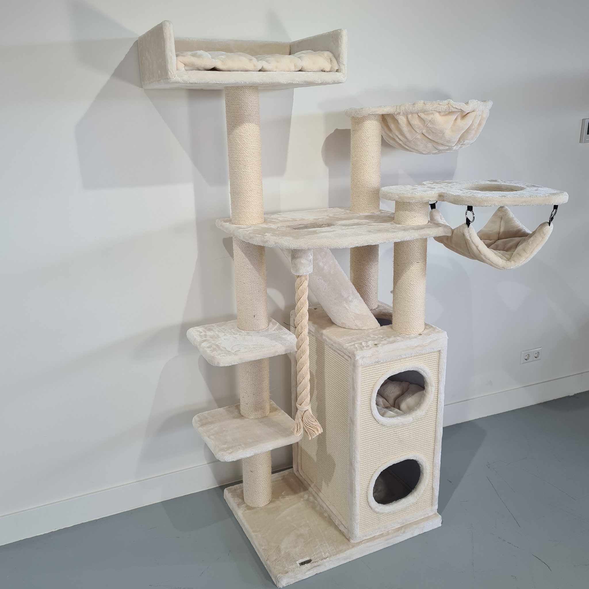 Door de hoogte van bijna 2 meter (1.95m) is het voor uw katten natuurlijk geweldig om vanuit daar hun domein in de gaten te kunnen houden. Ook is er nog een enorme krabton van 80x40x55cm met 2 grote ingangen van 20cm in diameter welke volledig bekleed is met hoogkwalitatief sisal. Deze komt met 1 heerlijk dik kussen waardoor uw kat zich heerlijk kan terugtrekken of verstoppen in een van de verdiepingen.