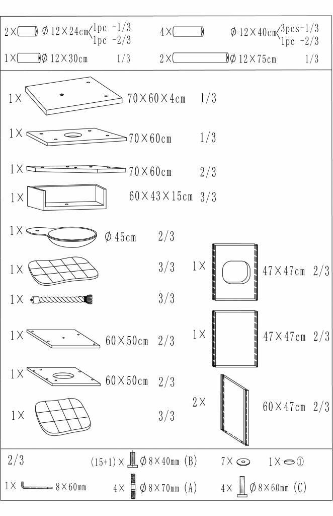 – Speelhuis: 50 x 60 x 50 cm . Buitenzijde bekleed met sisalkleed. Gaten voorzijde 25 x 18 cm ovaal.