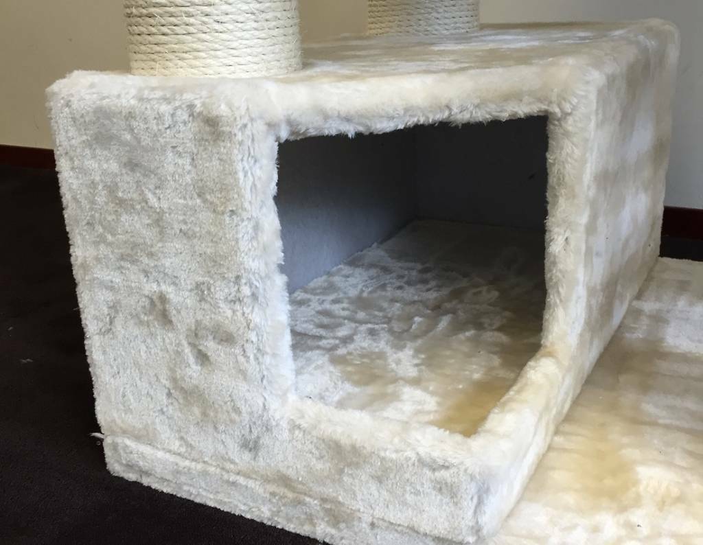 Met een grote dikke bodemplaat van 65x55x4cm en onderin een trap bekleed met sisalkleed om aan te krabben en daar op het verstophuis (55,5x30x25cm) en heeft een extra grote ingang.