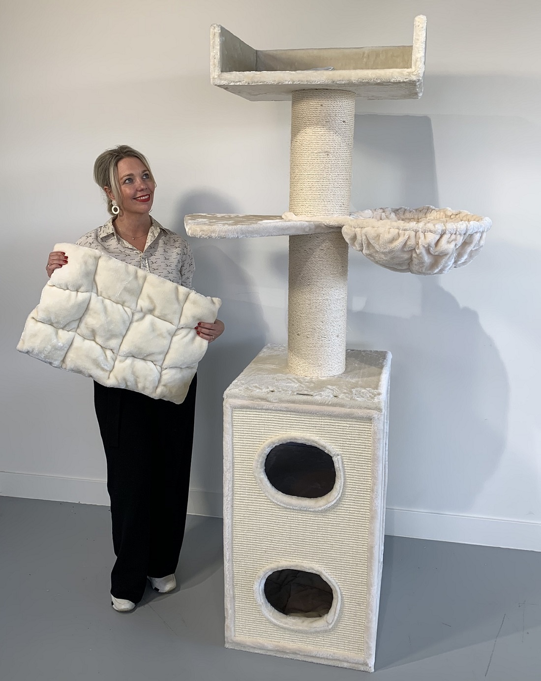 Het speelhuis onderin heeft twee ruime ingangen en is geheel bekleed met sisal waaraan de kat lekker uitgestrekt kan krabben. Hierin ligt een heerlijk zacht doorgestikt kussen dat uitneembaar en wasbaar is. Het draaibare ligplateau is bekleed met fijne zachte pluche.