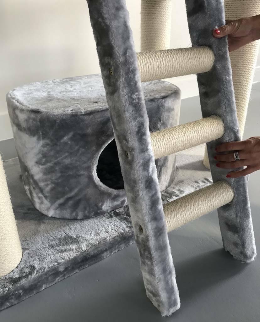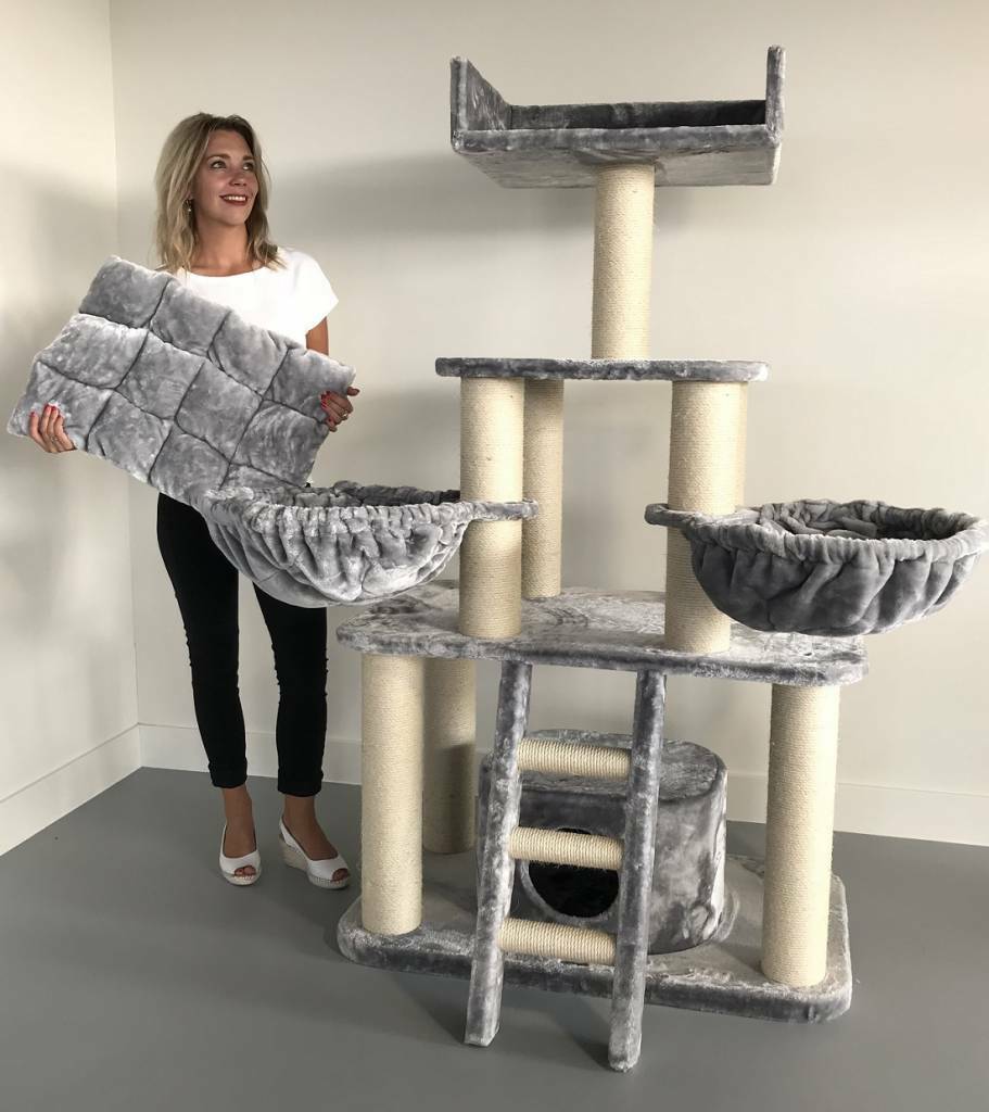 Krabpaal Light Grey Panther is een mega stevige krabpaal. De Panther heeft 12cm dikke en grote 45cmØ hangmatten en een mega grote directiezetel van 60x43x15cm met uitneembaar kussen.
