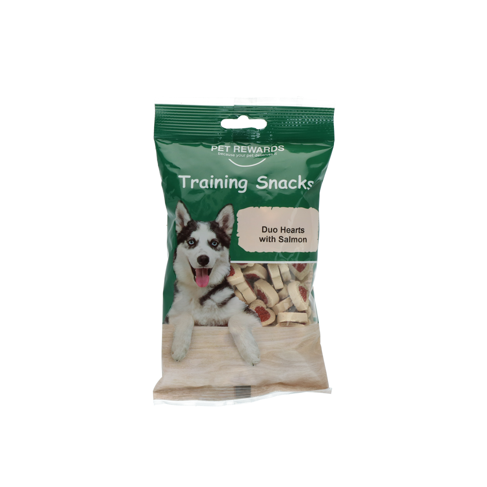 trainer-snack is gevuld met vlees en zalm en is een semi-moist soft beloning.