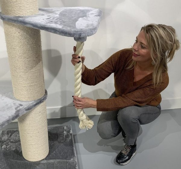 Driehoekige ligplaats met speeltouw. Makkelijk te plaatsen tussen de twee sisalpalen en een geweldige aanvulling op uw nieuwe of huidige krabpaal.